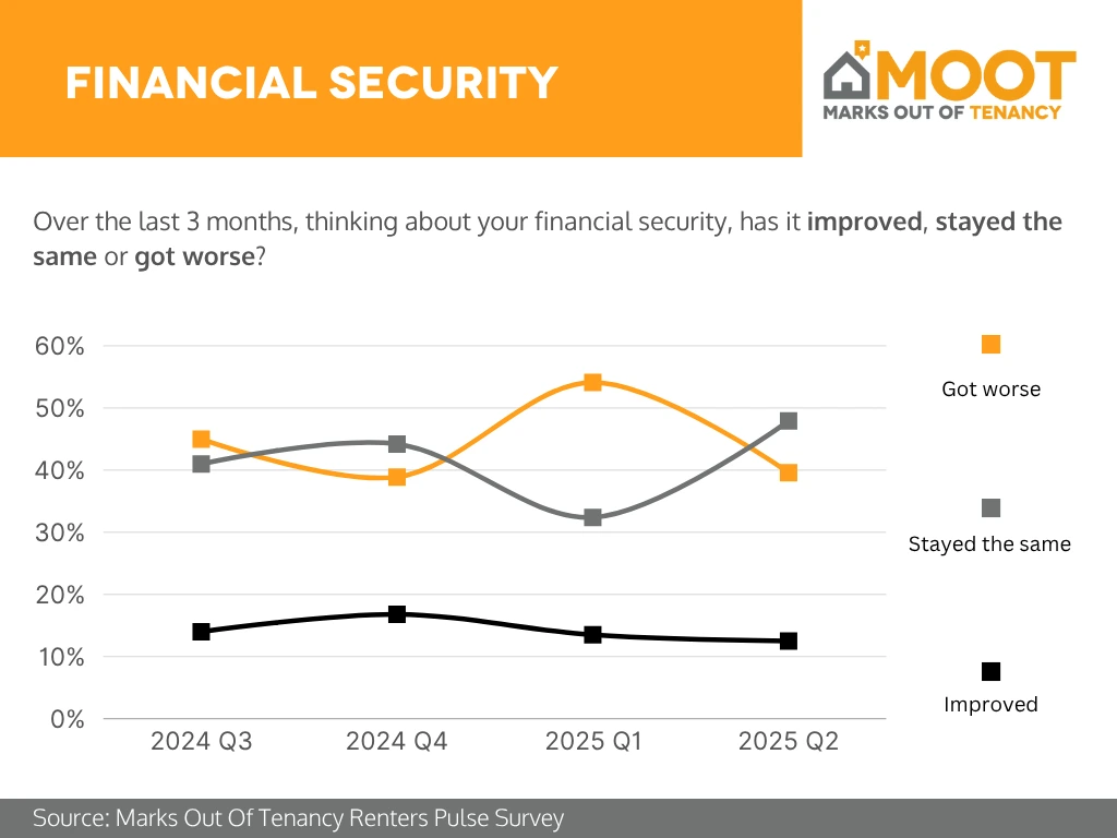 Analysis: Financial wellbeing showed signs of renewed strain in 2025 Q2. The percentage of renters who felt their financial security had gotten worse fell to 40%, a significant improvement from the high of 55% in Q1. However, this was countered by a sharp increase in those saying it stayed the same—48%, up from 27%. Only 12% said their financial situation had improved, continuing a slow decline from Q4 2024 (16%). While fewer tenants reported worsening conditions, very few are experiencing better outcomes, suggesting stabilisation but not recovery. This flatlining trend may reflect economic pressures like inflation or stagnant wages against high living costs.