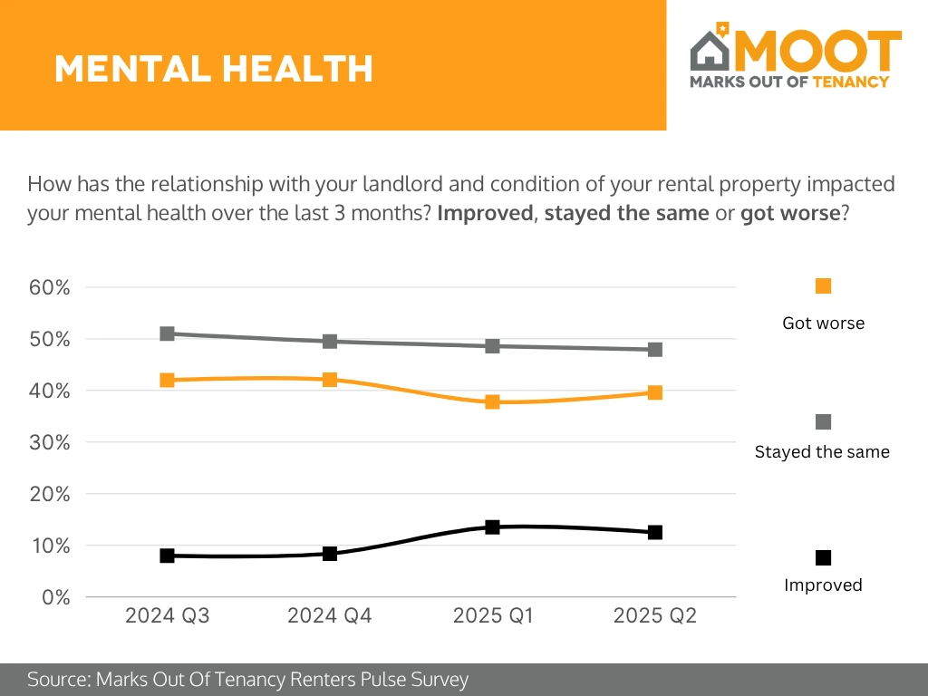 Analysis: Tenant mental health in 2025 Q2 remained largely unchanged and under strain. Nearly 48% said their mental health stayed the same, and a concerning 40% said it got worse, the latter remaining consistent with earlier quarters. Only 12% reported improvement, slightly down from Q1. The data reflects enduring psychological stress associated with the rental experience, particularly in relation to landlord interactions and property conditions. Although there was a minor dip in negative responses between Q1 and Q2, the persistent low rate of improvement signals that systemic issues in rental living continue to weigh heavily on tenants' wellbeing.