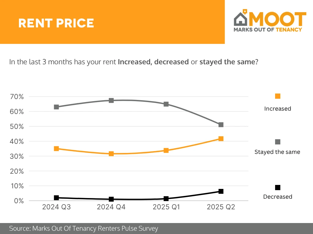 Analysis: In 2025 Q2, renters reported a slight easing of rent pressures, but the overall picture remains challenging. While 51% said their rent had stayed the same, this is down from nearly 68% in Q4 2024. 42% reported that their rent had increased, the highest since Q3 2024, indicating a resurgence in upward rent trends. A small but growing 7% saw their rent decrease, the most positive result in the yearlong period. Despite this uptick, the data still shows that rent hikes are far more common than reductions, which—when viewed alongside financial and mental health figures—highlights the sustained burden of rent on tenants’ lives.