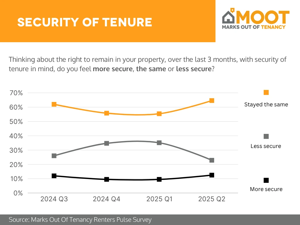 Question: Thinking about the right to remain in your property, over the last 3 months, with security of tenure in mind, do you feel more secure, the same, or less secure?