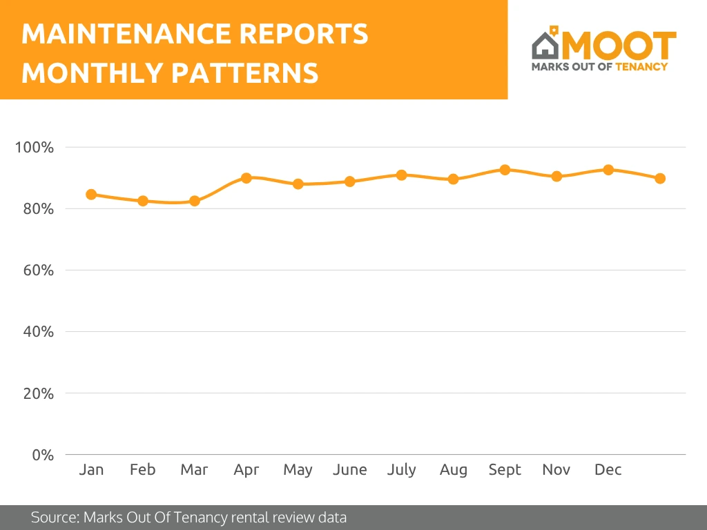 In contrast, reporting tends to dip slightly during the later winter months, particularly in February and March. This may be due to fewer tenancy changes and a general slowdown in reporting non-urgent issues during colder periods. Understanding these seasonal trends can help with forecasting and resourcing for maintenance response teams.