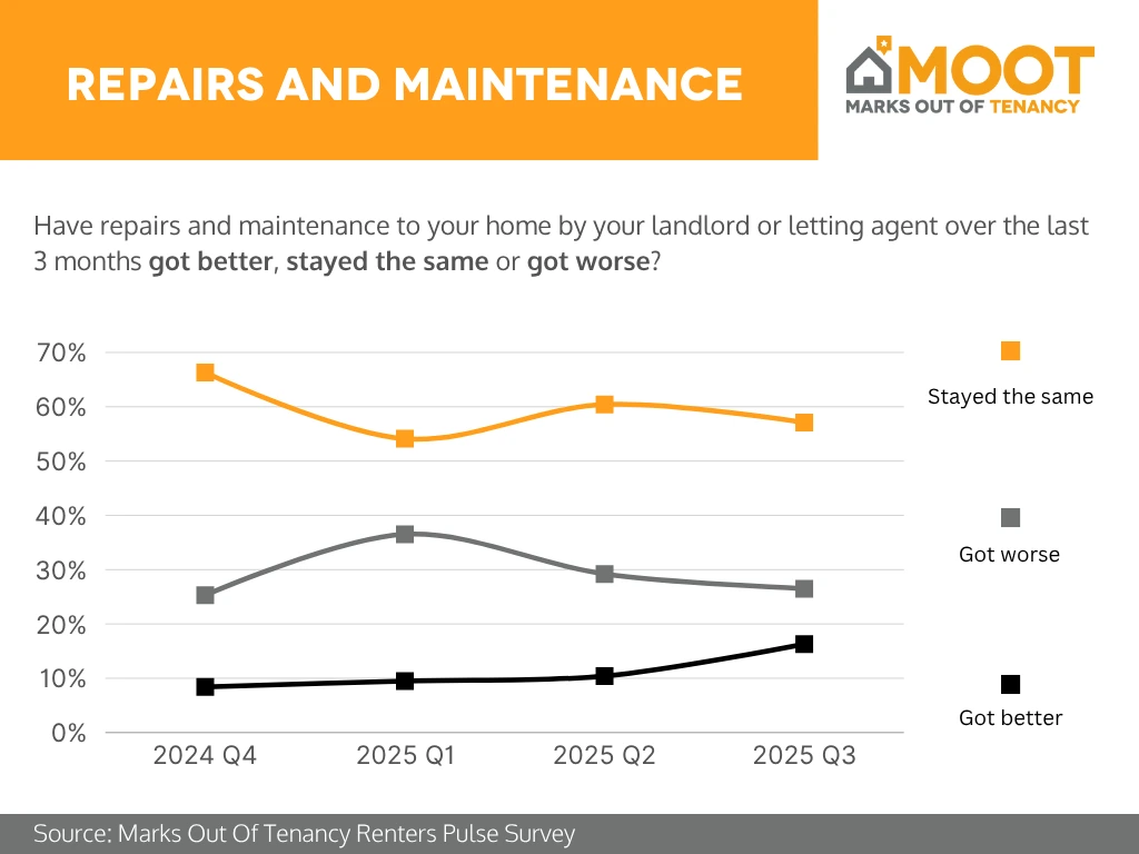 Analysis: By 2025 Q3, repairs and maintenance satisfaction showed modest improvement. About 58% of renters said conditions had stayed the same, while 26–27% felt things had got worse, continuing a mild downward trend from earlier in the year. Meanwhile, improvement perceptions reached their highest point in over a year at around 15%, suggesting some positive shifts in how landlords and agents respond to maintenance issues.