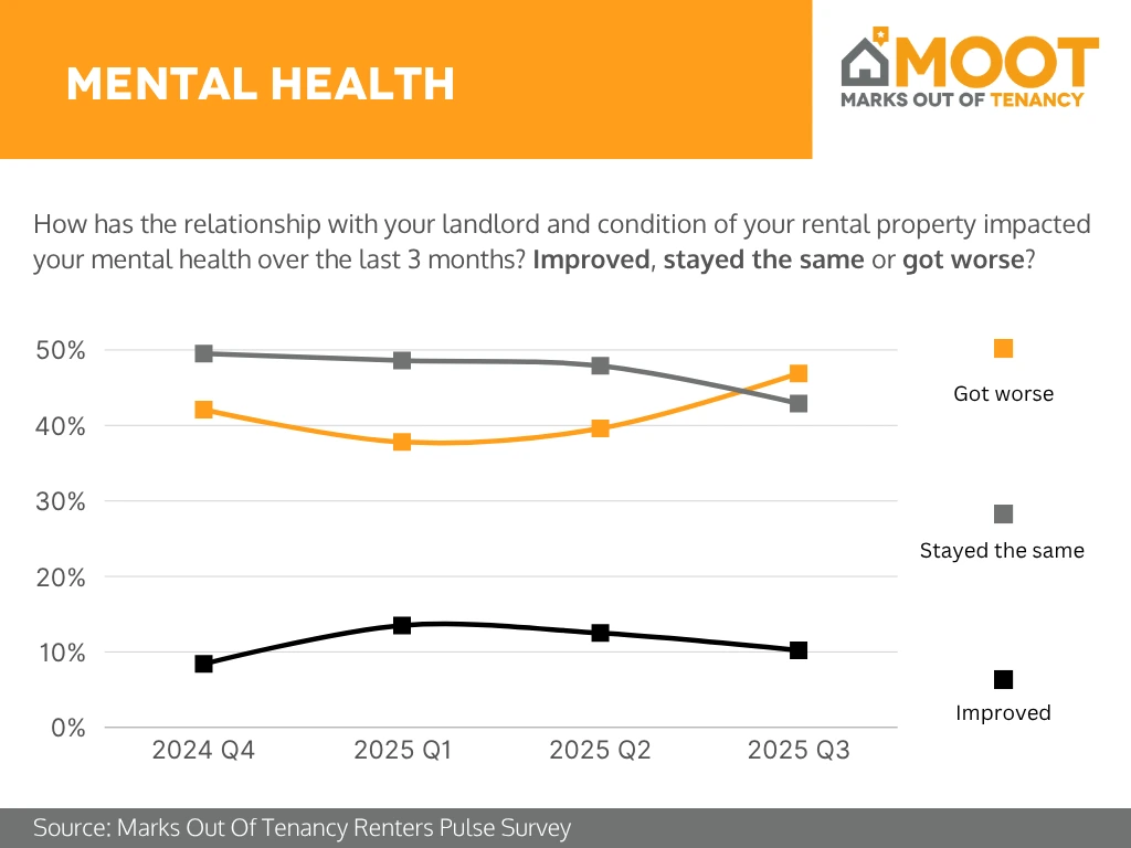 Analysis: In Q3 2025, renters’ mental health linked to housing circumstances showed mixed results. Around 45% said their wellbeing had stayed the same, while roughly 47–48% felt it had got worse, marking a small uptick from previous quarters. Those who reported improvements remained low, at about 10%. This suggests that while a steady portion of renters are coping, nearly half continue to experience worsening mental health due to housing stressors.