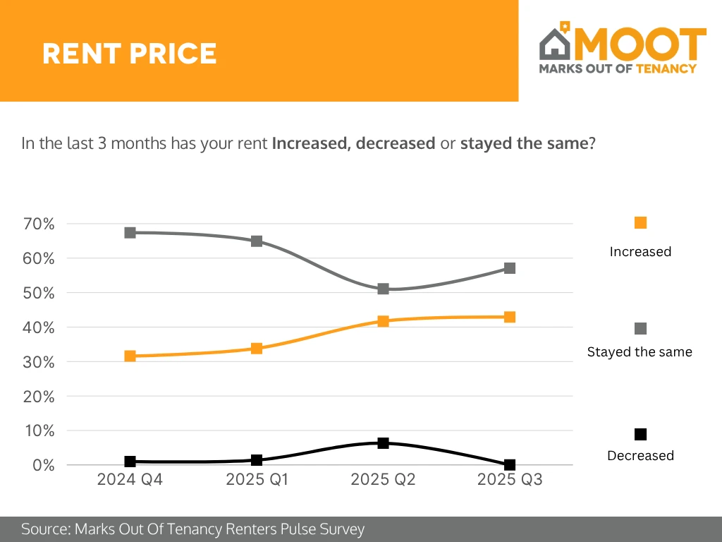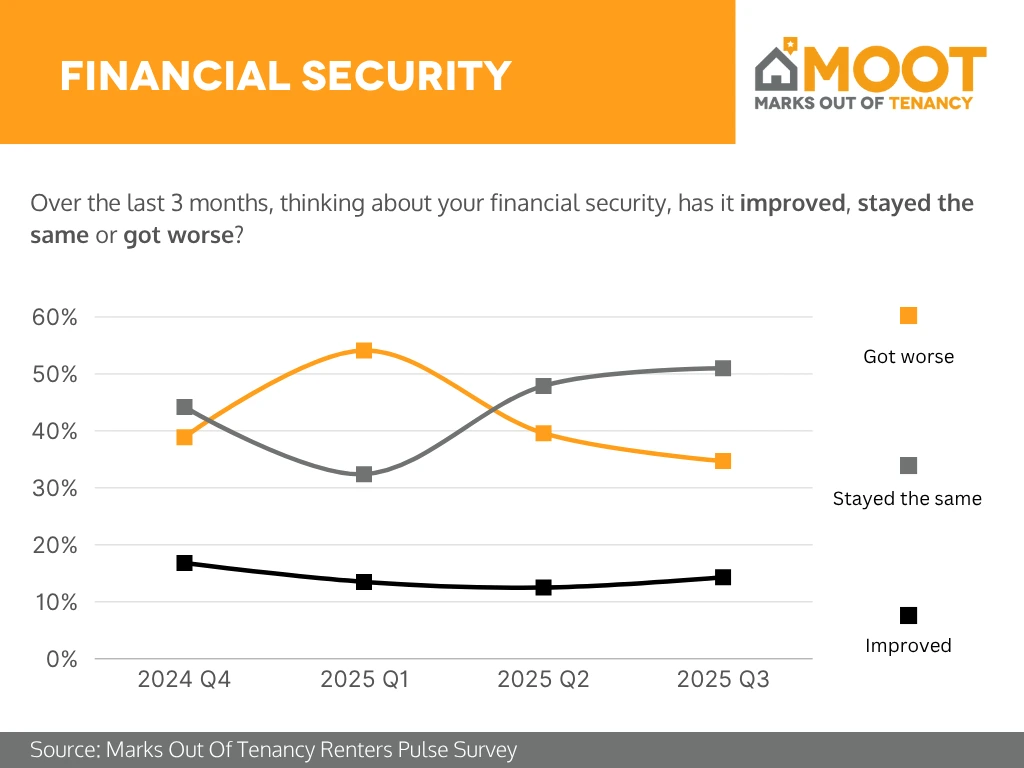 Analysis: By 2025 Q3, renters’ financial security remained strained. Over 50% said their situation had stayed the same, while roughly 35–38% reported it had got worse. Only about 12–15% experienced improvements. Although the proportion feeling worse off declined compared to earlier in 2025, the data still highlights persistent financial pressure among renters as living costs and rent increases continue to bite.