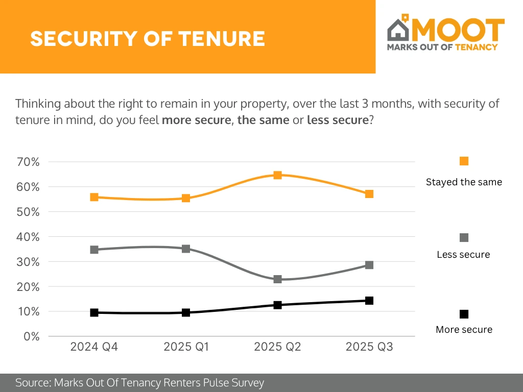 Analysis: In 2025 Q3, the majority of renters — around 58% — reported that their sense of security in their tenancy had stayed the same over the past three months. However, there was a slight increase in renters feeling less secure, rising to approximately 30%, while those who felt more secure edged up modestly to about 12–13%. This indicates that while most tenants’ sense of stability remained unchanged, there are signs of growing unease among a notable minority.