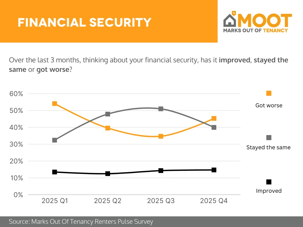 Analysis: In 2025 Q4, renters’ financial security showed signs of renewed pressure. Around 45% reported that their situation got worse, a clear increase from the previous quarter and the highest level since Q1. At the same time, the proportion saying their finances stayed the same fell to about 40%, while those reporting an improvement remained relatively low at around 15%. Overall, Q4 points to a deterioration in financial sentiment for many renters, with worsening conditions outweighing stability and only a small minority experiencing positive change.