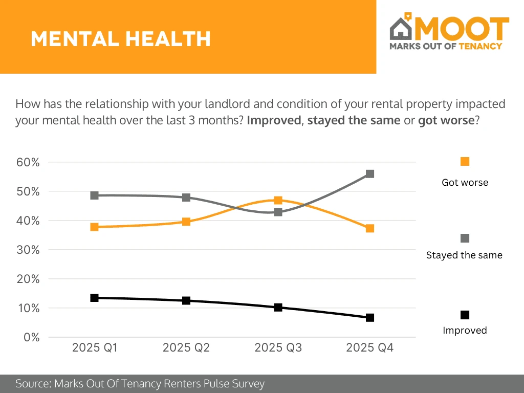 Analysis: In 2025 Q4, renters’ mental health was predominantly characterised by stability, but with concerning underlying trends. Just over half of renters (around 56%) said their mental health stayed the same, the highest level recorded during the year. However, the proportion reporting that their mental health got worse remained significant at around 37%, while those experiencing an improvement fell to under 10%, the lowest point in 2025. Overall, Q4 suggests that while conditions stabilised for many renters, there was little evidence of recovery, with worsening mental health continuing to affect a substantial minority and positive change becoming increasingly rare.