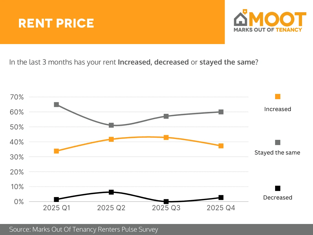 Analysis: In 2025 Q4, rent prices continued to place pressure on renters, with around 38% reporting that their rent had increased in the previous three months. The majority, at approximately 60%, said their rent stayed the same, marking a slight rise in stability compared with earlier in the year. Only a very small proportion, around 3%, experienced a decrease in rent. Overall, Q4 suggests that while outright rent rises affected fewer renters than in mid-2025, reductions remain rare and most tenants continue to face either rising costs or entrenched high rents rather than meaningful relief.