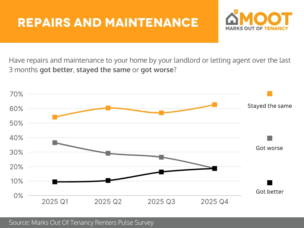 Analysis: In 2025 Q4, renters’ experiences of repairs and maintenance were largely stable, with nearly two-thirds (around 63%) reporting that service levels stayed the same over the previous three months. Encouragingly, the share who felt things got better rose to just under one in five (around 19%), continuing an upward trend seen through the year. At the same time, those saying conditions got worse fell to about 20%, the lowest level in 2025. Overall, Q4 suggests a gradual improvement in sentiment, with fewer renters experiencing deterioration and a growing minority seeing positive change, even though most continue to report no significant change.