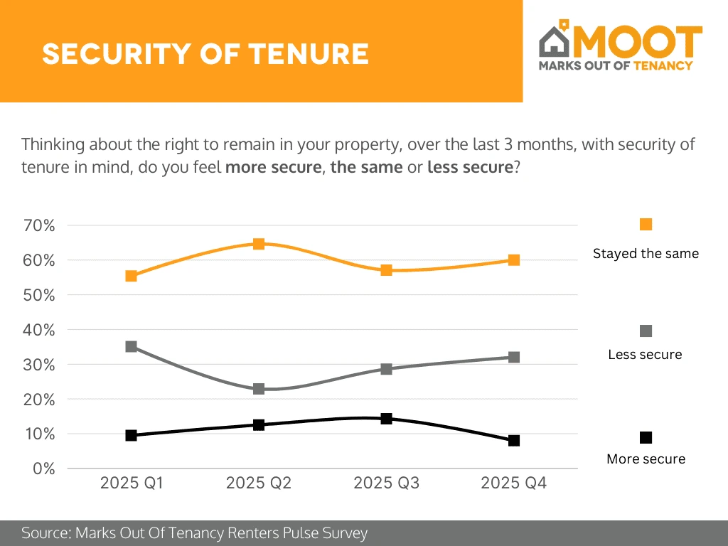Analysis: In 2025 Q4, renters’ feelings about security of tenure were largely unchanged, with around 60% saying they felt the same level of security as in the previous three months. However, there were mixed signals beneath this stability. The proportion who felt less secure rose to just over 30%, reversing some of the improvement seen earlier in the year, while those feeling more secure fell to under 10%, the lowest point in 2025. Overall, Q4 highlights continued uncertainty for a significant minority of renters, with stability for most but a noticeable tilt towards increased insecurity rather than growing confidence.